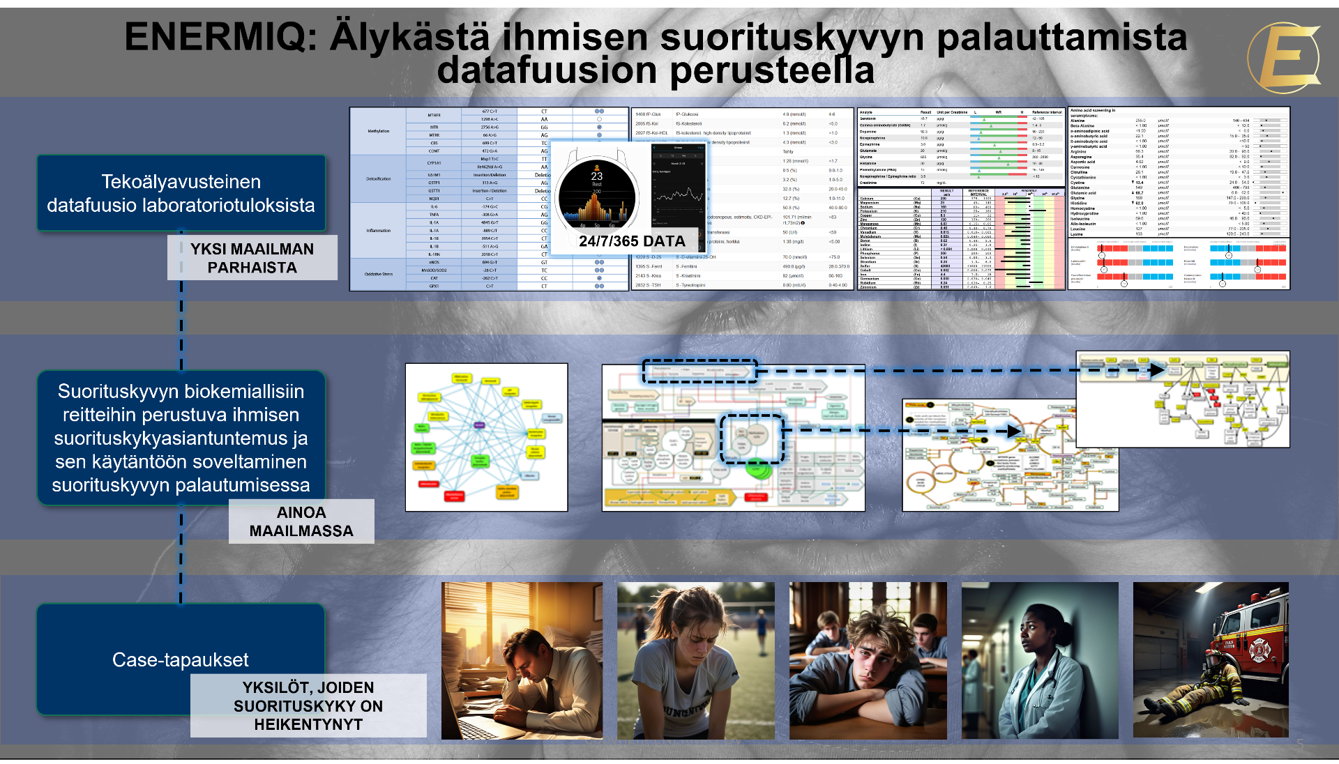 - Elimistön suorituskykyyn vaikuttavien yli 40 biokemiallisen ketjun ja kierron tilanteen selvittäminen (laboratoriotestit + wearables) sekä niiden AI-tuettu analyysi ja synteesi, joka huomioi yksittäisten datapisteiden keskinäisriippuvuudet